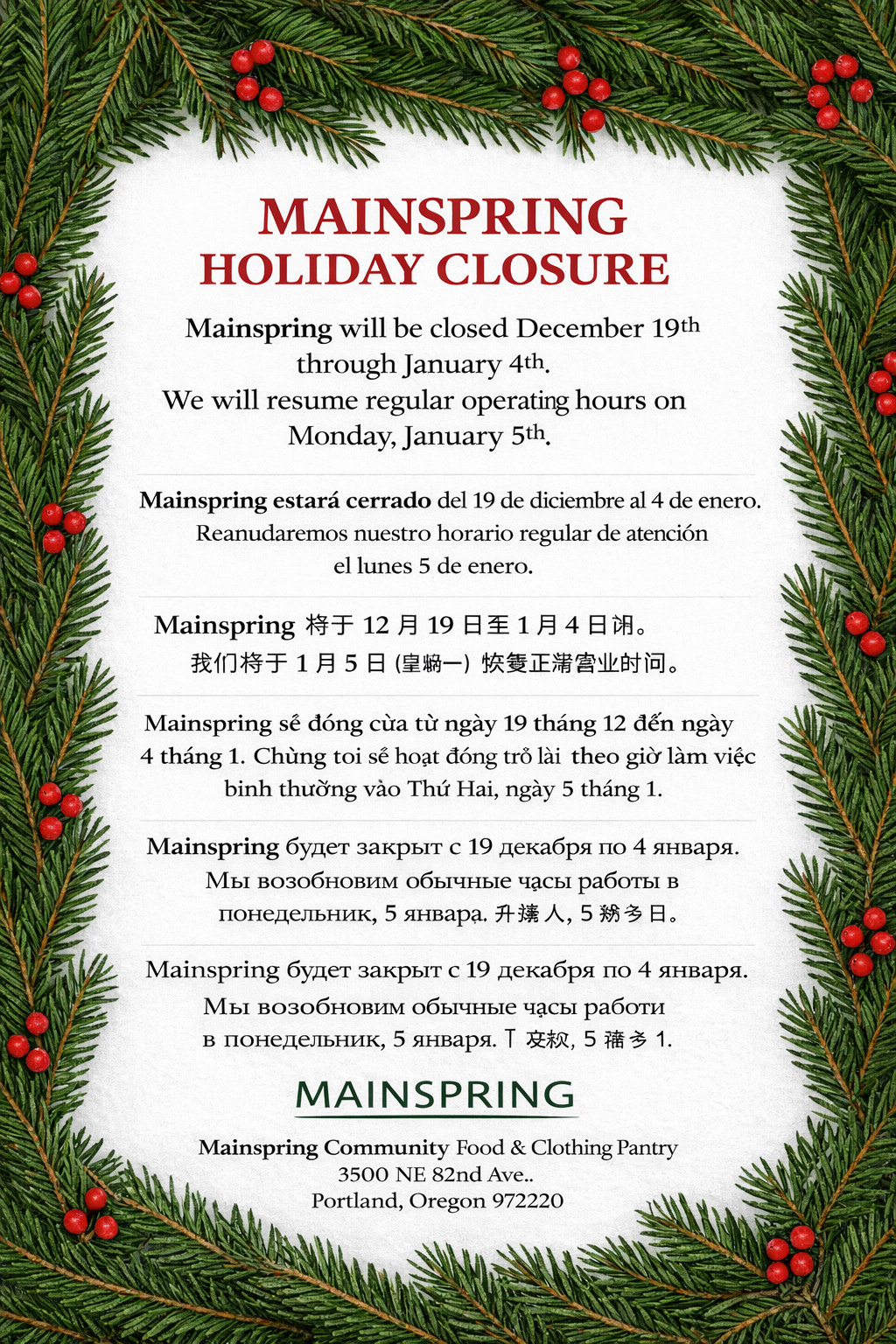 At Mainspring, we are a voice for change, raising awareness and building partnerships to address the root causes of economic hardship, including food and clothing insecurity. Mainspring is a non-profit organization focused on providing equitable comprehensive services to meet the basic needs of residents within and beyond Portland.